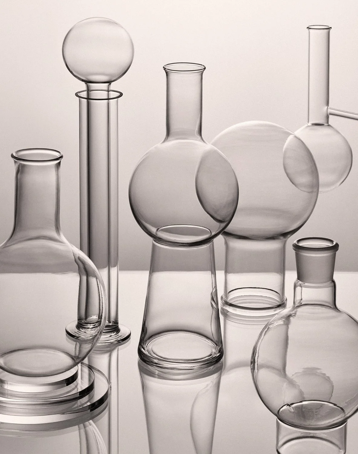 Our reinterpretation of these classic forms pays homage to their origin while transforming them into refined design objects. Each piece carries the spirit of precision, clarity, and quiet beauty that defined the golden era of glassblown science.